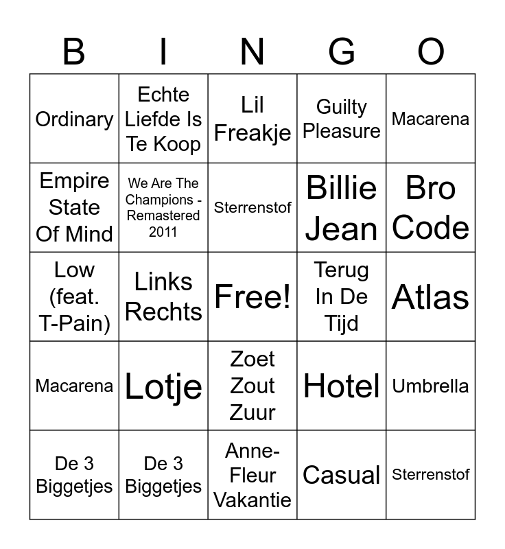This bingo card has a free space and 25 words: Lotje, Anne-Fleur Vakantie, Sterrenstof, De 3 Biggetjes, Macarena, Ordinary, Empire State Of Mind, Echte Liefde Is Te Koop, Terug In De Tijd, Zoet Zout Zuur, Billie Jean, Low (feat. T-Pain), Hotel, Umbrella, We Are The Champions - Remastered 2011, Sugardaddy, Atlas, Lil Freakje, Bro Code, Links Rechts, Sterrenstof, De 3 Biggetjes, Macarena, Guilty Pleasure and Casual.