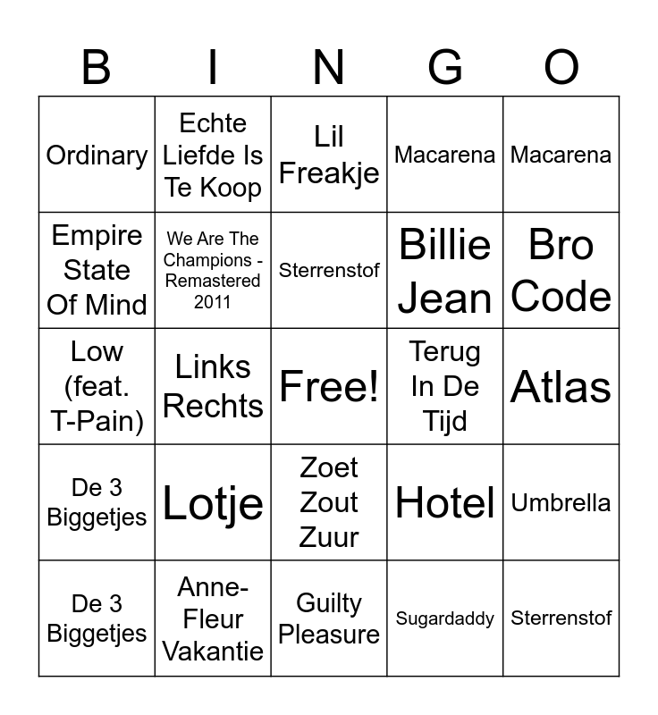 This bingo card has a free space and 24 words: Lotje, Anne-Fleur Vakantie, Sterrenstof, De 3 Biggetjes, Macarena, Ordinary, Empire State Of Mind, Echte Liefde Is Te Koop, Terug In De Tijd, Zoet Zout Zuur, Billie Jean, Low (feat. T-Pain), Hotel, Umbrella, We Are The Champions - Remastered 2011, Sugardaddy, Atlas, Lil Freakje, Bro Code, Links Rechts, Sterrenstof, De 3 Biggetjes, Macarena and Guilty Pleasure.