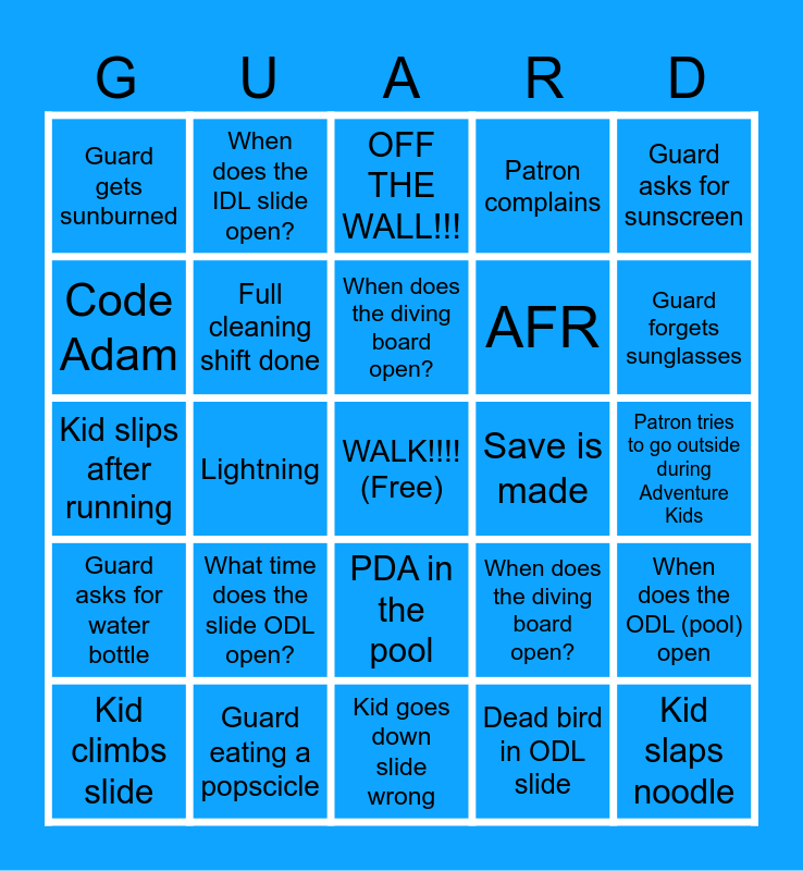 This bingo card has a free space and 29 words: Kid climbs slide, Fully staffed shift, Lightning, Manager forgets to turn on Wash Park radio, Guard gets sunburned, OFF THE WALL!!!, Full cleaning shift done, What time does the slide ODL open?, Save is made, Guard eating a popscicle, Patron tries to go outside during Adventure Kids, Kid slaps noodle, Kid goes down slide wrong, Dead bird in ODL slide, Guard forgets sunglasses, Front desk doesn't answer the radio, PDA in the pool, Guard asks for water bottle, Guard asks for sunscreen, Kid slips after running, When does the diving board open?, Age check, AFR, Code Adam, Patron complains, When does the IDL slide open?, When does the ODL (pool) open, When does the diving board open? and Snacks empty.