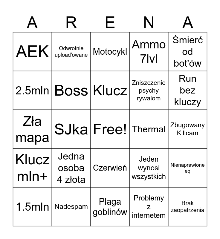 This bingo card has a free space and 24 words: Jedna osoba 4 złota, Nadespam, Klucz, 1.5mln, Śmierć od bot'ów, AEK, 2.5mln, Odwrotnie upload'owane, Thermal, Czerwień, Zniszczenie psychy rywalom, Zła mapa, Jeden wynosi wszystkich, Nienaprawione eq, Boss, Problemy z internetem, Zbugowany Killcam, Motocykl, Run bez kluczy, SJka, Brak zaopatrzenia, Klucz mln+, Ammo 7lvl and Plaga goblinów.