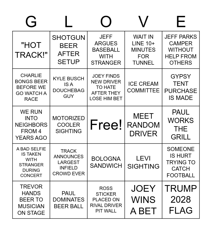This bingo card has a free space and 24 words: TRACK ANNOUNCES LARGEST INFIELD CROWD EVER, PAUL DOMINATES BEER BALL, JOEY FINDS NEW DRIVER TO HATE AFTER THEY LOSE HIM BET, TREVOR HANDS BEER TO MUSICIAN ON STAGE, JEFF PARKS CAMPER WITHOUT HELP FROM OTHERS, "HOT TRACK!", CHARLIE BONGS BEER BEFORE WE GO WATCH A RACE, SHOTGUN BEER AFTER SETUP, MEET RANDOM DRIVER, BOLOGNA SANDWICH, ICE CREAM COMMITTEE, WE RUN INTO NEIGHBORS FROM 4 YEARS AGO, LEVI SIGHTING, SOMEONE IS HURT TRYING TO CATCH FOOTBALL, KYLE BUSCH IS A DOUCHEBAG GUY, JOEY WINS A BET, PAUL WORKS THE GRILL, JEFF ARGUES BASEBALL WITH STRANGER, GYPSY TENT PURCHASE IS MADE, MOTORIZED COOLER SIGHTING, TRUMP 2028 FLAG, A BAD SELFIE IS TAKEN WITH STRANGER DURING CONCERT, WAIT IN LINE 10+ MINUTES FOR TUNNEL and ROSS STICKER PLACED ON RIVAL DRIVER PIT WALL.