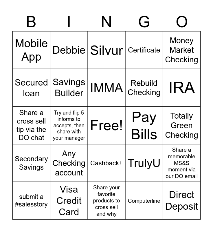 This bingo card has a free space and 24 words: Any Checking account, Visa Credit Card, IMMA, submit a #salesstory, Money Market Checking, Mobile App, Secured loan, Debbie, Pay Bills, Cashback+, Rebuild Checking, Share a cross sell tip via the DO chat, TrulyU, Share a memorable MS&S moment via our DO email, Savings Builder, Computerline, Totally Green Checking, Silvur, IRA, Try and flip 5 informs to accepts, then share with your manager, Direct Deposit, Secondary Savings, Certificate and Share your favorite products to cross sell and why.