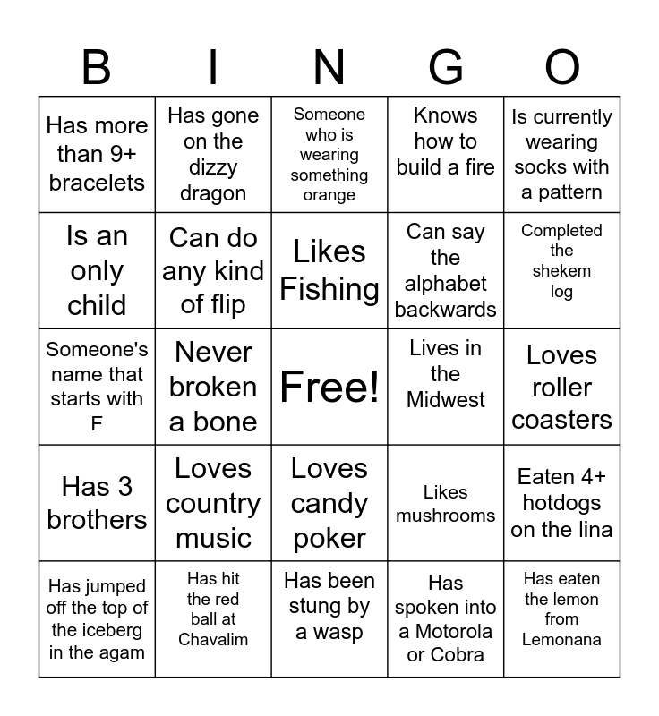 This bingo card has a free space and 24 words: Loves country music, Has hit the red ball at Chavalim, Likes Fishing, Has jumped off the top of the iceberg in the agam, Is currently wearing socks with a pattern, Has more than 9+ bracelets, Is an only child, Has gone on the dizzy dragon, Lives in the Midwest, Loves candy poker, Can say the alphabet backwards, Someone's name that starts with F, Likes mushrooms, Eaten 4+ hotdogs on the lina, Can do any kind of flip, Has spoken into a Motorola or Cobra, Loves roller coasters, Someone who is wearing something orange, Completed the shekem log, Never broken a bone, Has eaten the lemon from Lemonana, Has 3 brothers, Knows how to build a fire and Has been stung by a wasp.