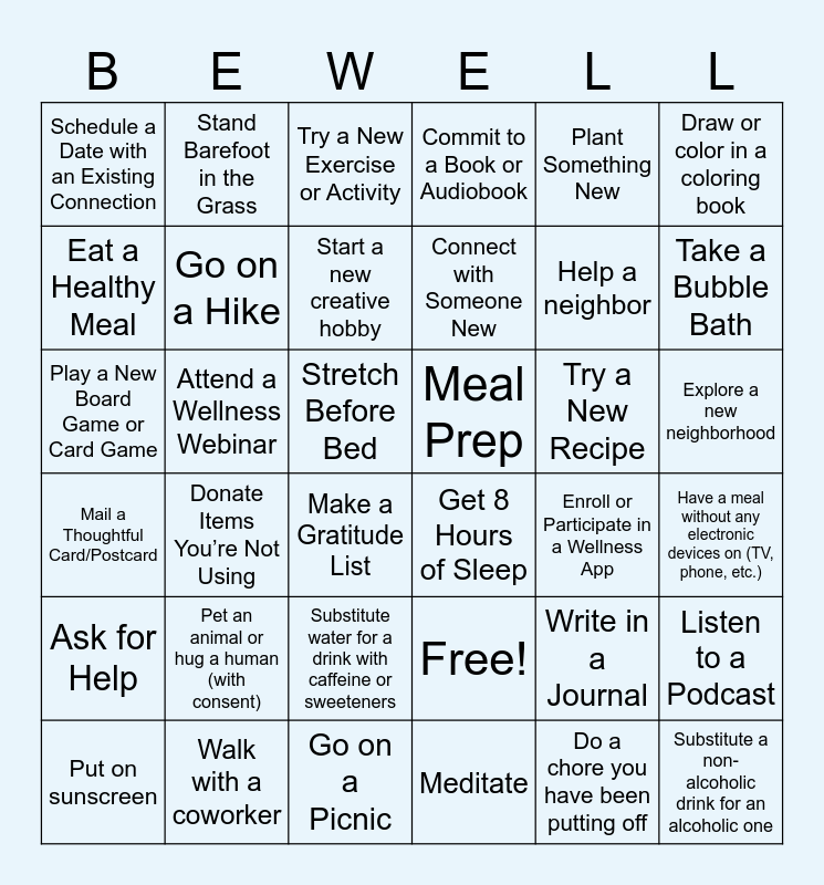 This bingo card has 36 words: Free!, Substitute water for a drink with caffeine or sweeteners, Meditate, Eat a Healthy Meal, Mail a Thoughtful Card/Postcard, Meal Prep, Go on a Hike, Go on a Picnic, Plant Something New, Write in a Journal, Take a Bubble Bath, Commit to a Book or Audiobook, Listen to a Podcast, Attend a Wellness Webinar, Connect with Someone New, Schedule a Date with an Existing Connection, Ask for Help, Try a New Recipe, Play a New Board Game or Card Game, Try a New Exercise or Activity, Stretch Before Bed, Donate Items You’re Not Using, Get 8 Hours of Sleep, Make a Gratitude List, Enroll or Participate in a Wellness App, Stand Barefoot in the Grass, Help a neighbor, Walk with a coworker, Start a new creative hobby, Draw or color in a coloring book, Substitute a non-alcoholic drink for an alcoholic one, Put on sunscreen, Have a meal without any electronic devices on (TV, phone, etc.), Explore a new neighborhood, Pet an animal or hug a human (with consent) and Do a chore you have been putting off.