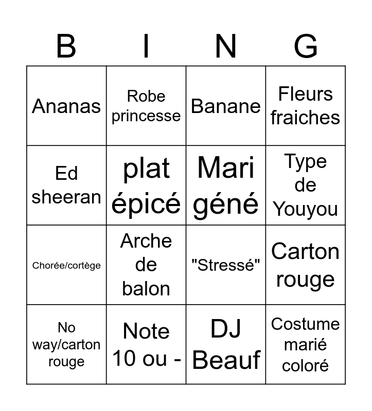 This bingo card has 16 words: Note 10 ou -, Carton rouge, Banane, Ananas, Chorée/cortège, Robe princesse, "Stressé", DJ Beauf, Ed sheeran, plat épicé, No way/carton rouge, Fleurs fraiches, Arche de balon, Type de Youyou, Mari géné and Costume marié coloré.