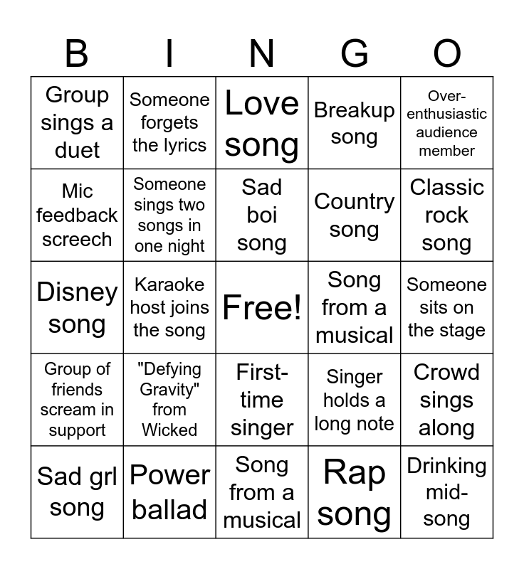 This bingo card has a free space and 24 words: "Defying Gravity" from Wicked, Power ballad, Sad boi song, Sad grl song, Over-enthusiastic audience member, Group sings a duet, Mic feedback screech, Someone forgets the lyrics, Song from a musical, First-time singer, Country song, Disney song, Singer holds a long note, Crowd sings along, Someone sings two songs in one night, Rap song, Someone sits on the stage, Love song, Classic rock song, Karaoke host joins the song, Drinking mid-song, Group of friends scream in support, Breakup song and Song from a musical.