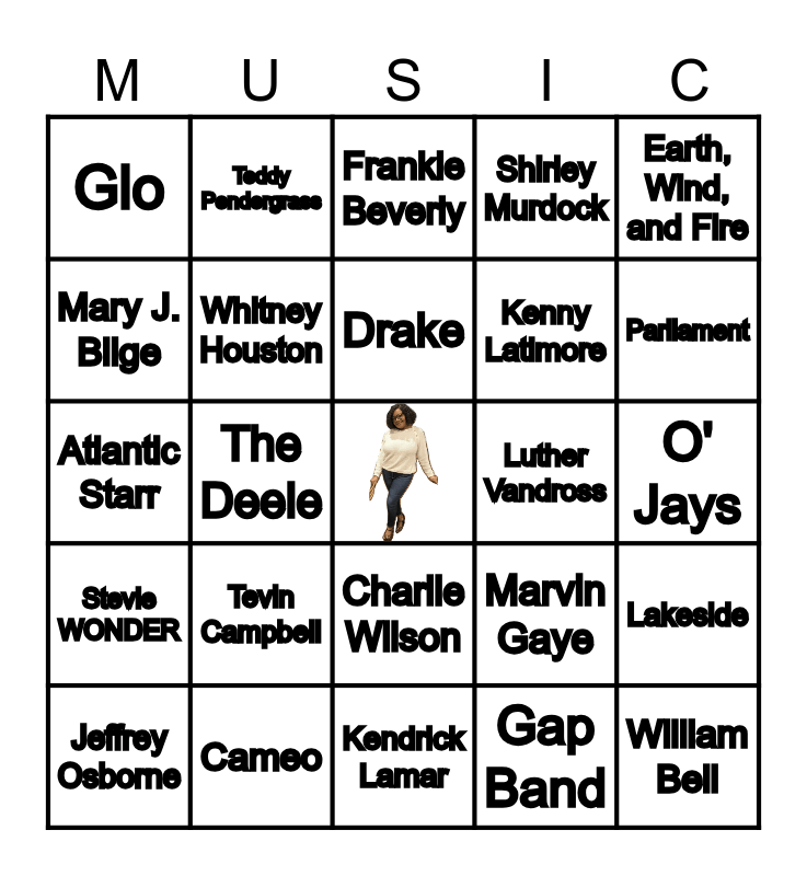 This bingo card has a free space and 24 words: Tevin Campbell, Cameo, Drake, Jeffrey Osborne, Earth, Wind, and Fire, Glo, Mary J. Blige, Teddy Pendergrass, Luther Vandross, Charlie Wilson, Kenny Latimore, Atlantic Starr, Marvin Gaye, Lakeside, Whitney Houston, Gap Band, O' Jays, Frankie Beverly, Parliament, The Deele, William Bell, Stevie WONDER, Shirley Murdock and Kendrick Lamar.