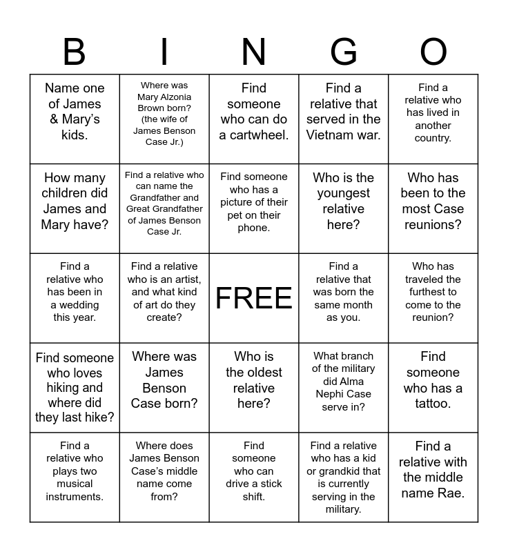 This bingo card has a free space and 24 words: Where was James Benson Case born?, Where does James Benson Case’s middle name come from?, Find someone who has a picture of their pet on their phone., Find a relative who plays two musical instruments., Find a relative who has lived in another country., Name one of James & Mary’s kids., How many children did James and Mary have?, Where was Mary Alzonia Brown born? (the wife of James Benson Case Jr.), Find a relative that was born the same month as you., Who is the oldest relative here?, Who is the youngest relative here?, Find a relative who has been in a wedding this year., What branch of the military did Alma Nephi Case serve in?, Find someone who has a tattoo., Find a relative who can name the Grandfather and Great Grandfather of James Benson Case Jr., Find a relative who has a kid or grandkid that is currently serving in the military., Who has traveled the furthest to come to the reunion?, Find someone who can do a cartwheel., Who has been to the most Case reunions?, Find a relative who is an artist, and what kind of art do they create?, Find a relative with the middle name Rae., Find someone who loves hiking and where did they last hike?, Find a relative that served in the Vietnam war. and Find someone who can drive a stick shift..