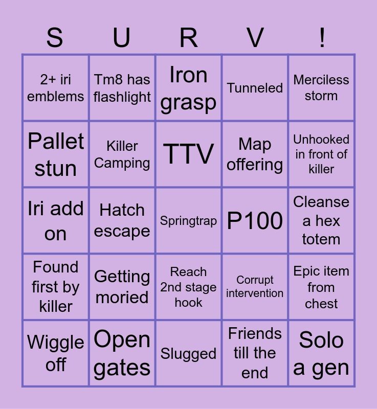 This bingo card has a free space and 39 words: Everyone escapes, Stealth killer, Hit on hook, Killer Camping, Wiggle off, Reach 2nd stage hook, TTV, Hooked in basement, Merciless storm, Found first by killer, Hatch escape, Tunneled, Solo a gen, Cleanse a hex totem, P100, Getting moried, Flashlight save, 2+ iri emblems, Pride charm, Corrupt intervention, Pallet stun, Slugged, Map offering, Unhooked in front of killer, Sandbaged, "how did he hit me", Licensed killer (Excludes spring trap), 4k, 3+ gens left remaining, Tm8 has flashlight, Locker grabbed, 3 gened, Iron grasp, Open gates, Friends till the end, Befriend killer, Epic item from chest, Iri add on and Killer dc.