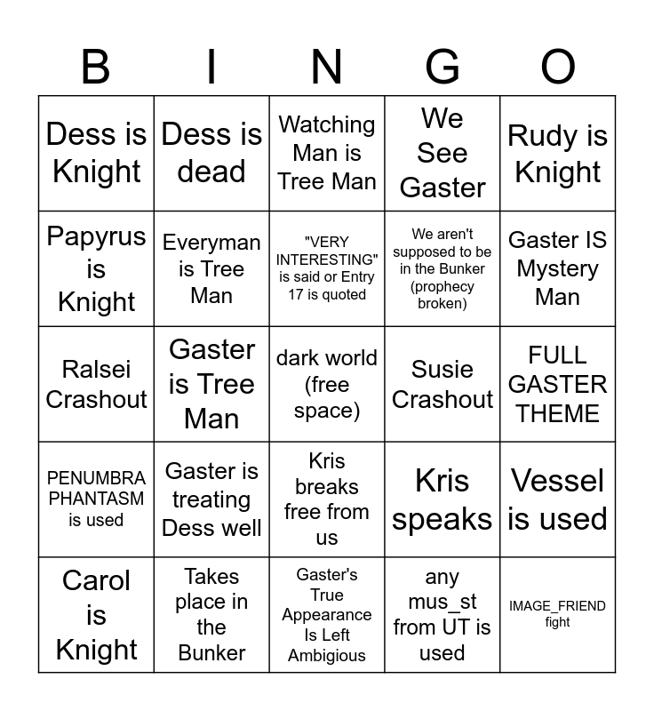 This bingo card has a free space and 24 words: Gaster is treating Dess well, Takes place in the Bunker, "VERY INTERESTING" is said or Entry 17 is quoted, Carol is Knight, Rudy is Knight, Dess is Knight, Papyrus is Knight, Dess is dead, Susie Crashout, Kris breaks free from us, We aren't supposed to be in the Bunker (prophecy broken), Ralsei Crashout, Kris speaks, Vessel is used, Everyman is Tree Man, any mus_st from UT is used, FULL GASTER THEME, Watching Man is Tree Man, Gaster IS Mystery Man, Gaster is Tree Man, IMAGE_FRIEND fight, PENUMBRA PHANTASM is used, We See Gaster and Gaster's True Appearance Is Left Ambigious.