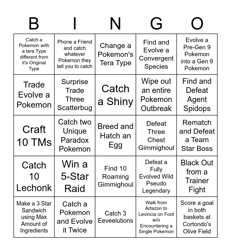 This bingo card has 25 words: Win a 5-Star Raid, Catch 3 Eeveelutions, Catch a Shiny, Make a 3 Star Sandwich using Max Amount of Ingredients, Evolve a Pre-Gen 9 Pokemon into a Gen 9 Pokemon, Catch a Pokemon with a tera Type different from it's Original Type, Trade Evolve a Pokemon, Phone a Friend and catch whatever Pokemon they tell you to catch, Defeat Three Chest Gimmighoul, Find 10 Roaming Gimmighoul, Wipe out an entire Pokemon Outbreak, Craft 10 TMs, Defeat a Fully Evolved Wild Pseudo Legendary, Black Out from a Trainer Fight, Surprise Trade Three Scatterbug, Score a goal in both baskets at Cortondo's Olive Field, Rematch and Defeat a Team Star Boss, Change a Pokemon's Tera Type, Find and Defeat Agent Spidops, Catch two Unique Paradox Pokemon, Breed and Hatch an Egg, Catch a Pokemon and Evolve it Twice, Catch 10 Lechonk, Find and Evolve a Convergent Species and Walk from Artazon to Levincia on Foot w/o Encountering a Single Pokemon.