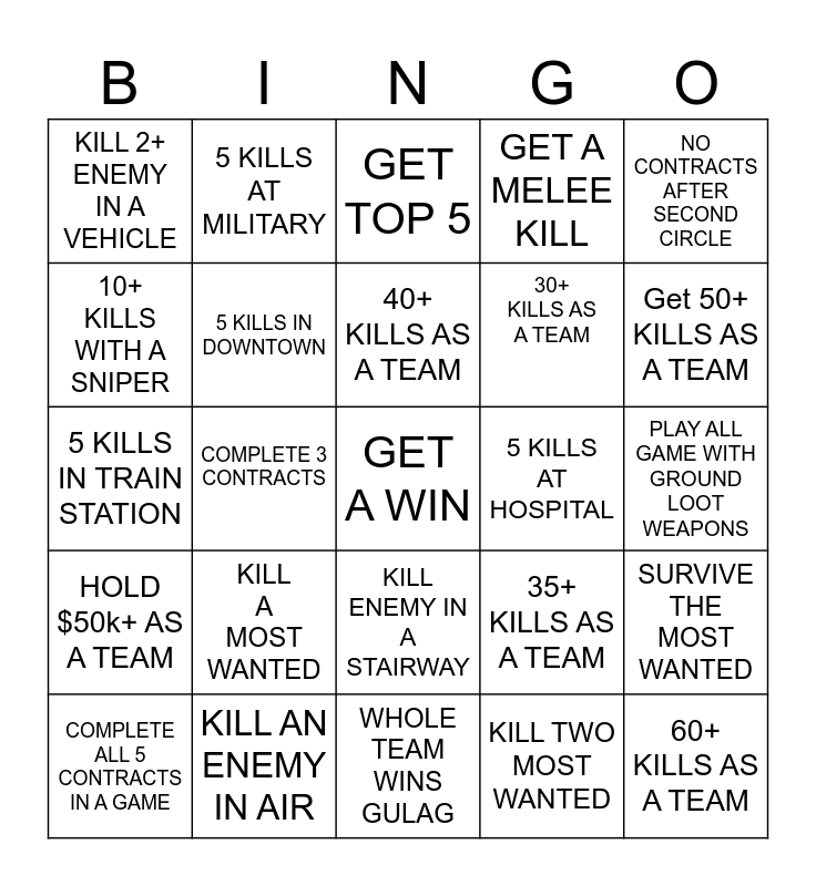 This bingo card has a free space and 24 words: KILL A MOST WANTED, KILL AN ENEMY IN AIR, 40+ KILLS AS A TEAM, COMPLETE ALL 5 CONTRACTS IN A GAME, NO CONTRACTS AFTER SECOND CIRCLE, KILL 2+ ENEMY IN A VEHICLE, 10+ KILLS WITH A SNIPER, 5 KILLS AT MILITARY, 5 KILLS AT HOSPITAL, KILL ENEMY IN A STAIRWAY, 30+ KILLS AS A TEAM, 5 KILLS IN TRAIN STATION, 35+ KILLS AS A TEAM, SURVIVE THE MOST WANTED, 5 KILLS IN DOWNTOWN, KILL TWO MOST WANTED, PLAY ALL GAME WITH GROUND LOOT WEAPONS, GET TOP 5, Get 50+ KILLS AS A TEAM, COMPLETE 3 CONTRACTS, 60+ KILLS AS A TEAM, HOLD $50k+ AS A TEAM, GET A MELEE KILL and WHOLE TEAM WINS GULAG.