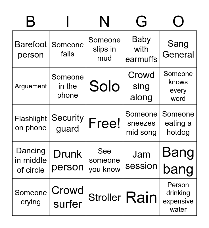This bingo card has a free space and 24 words: Drunk person, Crowd surfer, Solo, Someone crying, Sang General, Barefoot person, Arguement, Someone falls, Someone sneezes mid song, See someone you know, Crowd sing along, Flashlight on phone, Jam session, Bang bang, Someone in the phone, Rain, Someone eating a hotdog, Someone slips in mud, Someone knows every word, Security guard, Person drinking expensive water, Dancing in middle of circle, Baby with earmuffs and Stroller.
