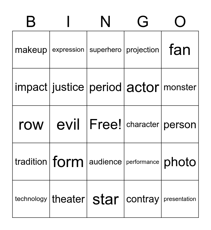 This bingo card has a free space and 24 words: form, theater, period, technology, fan, makeup, impact, expression, character, audience, actor, row, performance, photo, justice, contray, person, superhero, monster, evil, presentation, tradition, projection and star.