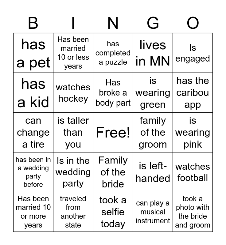 This bingo card has a free space and 24 words: Is in the wedding party, traveled from another state, Has broke a body part, Has been married 10 or more years, Is engaged, has a pet, has a kid, Has been married 10 or less years, family of the groom, Family of the bride, is wearing green, can change a tire, is left-handed, watches football, watches hockey, can play a musical instrument, is wearing pink, has completed a puzzle, has the caribou app, is taller than you, took a photo with the bride and groom, has been in a wedding party before, lives in MN and took a selfie today.