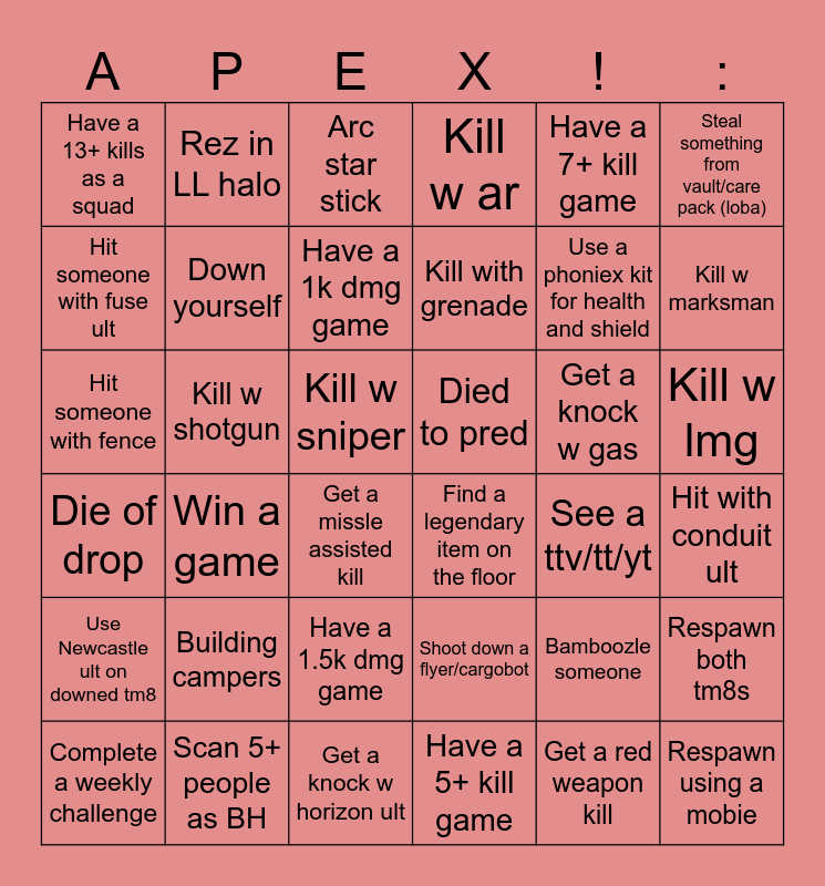 This bingo card has 70 words: Punch someone to death, Kill w sniper, Get finished, Have a 5+ kill game, Find a legendary item on the floor, Squad wipe, Kill w ar, Get a finisher, Have a 7+ kill game, Clutch a fight, Win a game, Kill w smg, Have a 13+ kills as a squad, Arc star stick, Kill w pistol, Kill w marksman, Kill w lmg, Have a 1k dmg game, Get a kill, Died to pred, Kill w shotgun, Die of drop, Kill with grenade, Have a 1.5k dmg game, Respawn both tm8s, Kill leader, Fall off map, Get a knock with bang ult, Hit with conduit ult, Knock with Gibby ult, Rez in LL halo, Mark some as vantage, Snare someone as ash, Grapple someone as pathy, Get a knock w horizon ult, Scan 5+ people as BH, Hit 3 people with crypto ult, Scan 5+ people in seer ult, Bamboozle someone, Steal something from vault/care pack (loba), Use Newcastle ult on downed tm8, Get a knock w gas, Hit someone with fence, Kill with Shelia, Hit some with spikes catalyst, Hit someone with fuse ult, Get a missle assisted kill, Get a red weapon kill, Get first kill of the game, Respawn using a mobie, (single) P20/Mozam kill, Lose a fight bc u hit for "9", Shoot down a flyer/cargobot, Complete a weekly challenge, See a ttv/tt/yt, Die to zone, Down yourself, Get a purp+ mag for a gun you aren't using, Get a charge rifle kill, Building campers, Use a phoniex kit for health and shield, Have 5+ revives, "Hes one", Shoot a crypto drone down, See a 4k 20, Golden boy, Kill champ squad, Get a kill @Hot zone, Find someone afk and Open a pack.