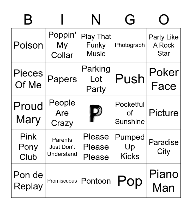 This bingo card has a free space and 37 words: Papa's Got A Brand New Bag, Paparazzi, Paper Rings, Papers, Paradise City, Parents Just Don't Understand, Parking Lot Party, Party In The U.S.A., Party Like A Rock Star, Peaches, People Are Crazy, Photograph, Piano Man, Picture, Pieces Of Me, Pink Pony Club, Play It Again, Play That Funky Music, Please Please Please, Pocketful of Sunshine, Poison, Poker Face, Pon de Replay, Pontoon, Pony, Pop, Poppin' My Collar, Pour Some Sugar On Me, Pretty Fly, Pretty Good At Drinkin' Beer, Private Dancer, Promiscuous, Proud Mary, Pump It, Pumped Up Kicks, Push and Put It On Me.