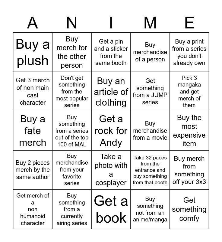 This bingo card has a free space and 24 words: Buy merchandise from your favorite series, Buy something from a currently airing series, Buy an article of clothing, Get merch of a non humanoid character, Buy a print from a series you don't already own, Buy a plush, Get 3 merch of non main cast character, Buy merch for the other person, Buy merchandise from a movie, Take a photo with a cosplayer, Get something from a JUMP series, Buy a fate merch, Take 32 paces from the entrance and buy something from that booth, Buy merch from something off your 3x3, Don't get something from the most popular series, Buy something not from an anime/manga, Buy the most expensive item, Get a pin and a sticker from the same booth, Pick 3 mangaka and get merch of them, Buy something from a series out of the top 100 of MAL, Get something comfy, Buy 2 pieces merch by the same author, Buy merchandise of a person and Get a book.