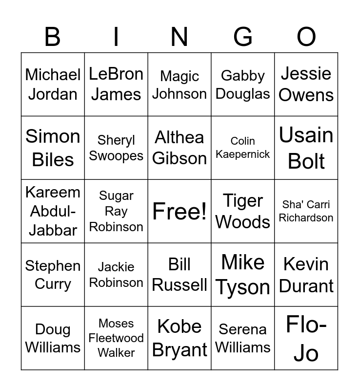 This bingo card has a free space and 24 words: Jackie Robinson, Moses Fleetwood Walker, Althea Gibson, Doug Williams, Jessie Owens, Michael Jordan, Simon Biles, LeBron James, Tiger Woods, Bill Russell, Colin Kaepernick, Kareem Abdul-Jabbar, Mike Tyson, Kevin Durant, Sheryl Swoopes, Serena Williams, Sha' Carri Richardson, Magic Johnson, Usain Bolt, Sugar Ray Robinson, Flo-Jo, Stephen Curry, Gabby Douglas and Kobe Bryant.