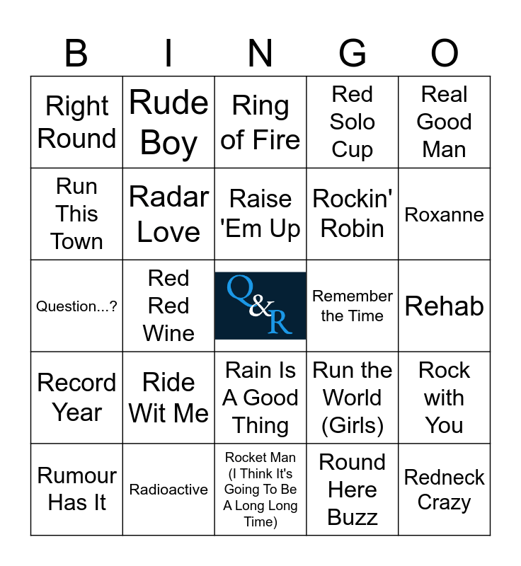 This bingo card has a free space and 41 words: Queen Of My Double Wide Trailer, Question...?, Quit Playing Games (With My Heart), Radar Love, Radioactive, Rain Is A Good Thing, Raise 'Em Up, Raise Up, Real Good Man, Record Year, Red Red Wine, Red Solo Cup, Redneck Crazy, Rehab, Remember the Time, Ride Wit Me, Ridin', Right Round, Right Thurr, Ring of Fire, Rock with You, Rock Your Body, Rocket Man (I Think It's Going To Be A Long Long Time), Rockin' Robin, Rockstar, Rolling in the Deep, Round Here Buzz, Route 66, Roxanne, Royals, Ruby Tuesday, Rude Boy, Rumour Has It, Run It!, Run the World (Girls), Run This Town, Run To You, Runaway, Runaway Love, Runnin' With The Devil and Running With The Night.