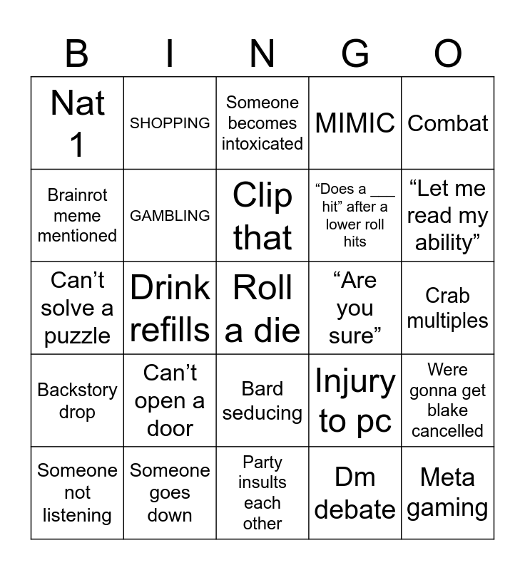 This bingo card has a free space and 29 words: Someone not listening, Bathroom break, Drink refills, Nat 20, Nat 1, Someone becomes intoxicated, GAMBLING, Can’t open a door, “Are you sure”, Someone goes down, Crab multiples, Meta gaming, Party insults each other, Dm debate, “Let me read my ability”, Dm makes an npc name on the spit, Bard seducing, Backstory drop, Combat, Can’t solve a puzzle, Injury to pc, Party becomes criminals, “Does a ___ hit” after a lower roll hits, Brainrot meme mentioned, MIMIC, SHOPPING, Were gonna get blake cancelled, Clip that and Player misses a session (mainly Blake).