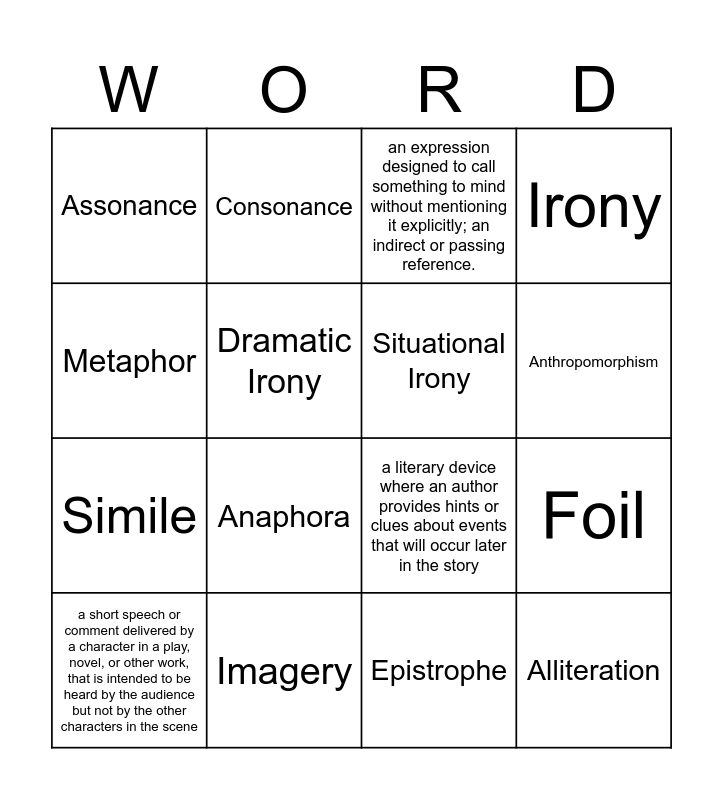 This bingo card has 18 words: Anaphora, Alliteration, an expression designed to call something to mind without mentioning it explicitly; an indirect or passing reference., Assonance, a literary device where an author provides hints or clues about events that will occur later in the story, Irony, a short speech or comment delivered by a character in a play, novel, or other work, that is intended to be heard by the audience but not by the other characters in the scene, Consonance, Anthropomorphism, Simile, Epistrophe, Metaphor, Foil, Dramatic Irony, Situational Irony, Personification, Imagery and Verbal Irony.