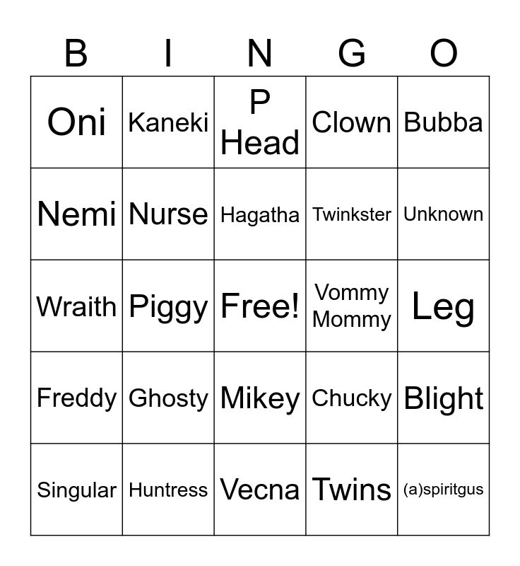 This bingo card has a free space and 40 words: Trapper, Wraith, Billy, Nurse, Huntress, Mikey, Hagatha, Dr pepper, Bubba, Freddy, Piggy, Clown, (a)spiritgus, Leg, Vommy Mommy, Ghosty, Buppy, Oni, Peepaw, P Head, Blight, Twins, Twinkster, Nemi, Pin Head, Artist, Onryo, Dredge, Wesky, Knight, Skull Merchant, Singular, Alien, Chucky, Unknown, Vecna, Dracula, Buppy Mommy, Kaneki and Springtrap.