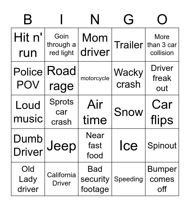 This bingo card has a free space and 29 words: Old Lady driver, Semi Truck, Sprots car crash, Raining, Hit n' run, Mom driver, Road rage, Jeep, Snow, California Driver, Car flips, Bumper comes off, Bad security footage, Speeding, Driver freak out, Horn honk, Near fast food, Dumb Driver, More than 3 car collision, Loud music, Ice, Crash into non-vehicle, Wacky crash, Police POV, Trailer, Goin through a red light, Spinout, motorcycle and Ford truck.