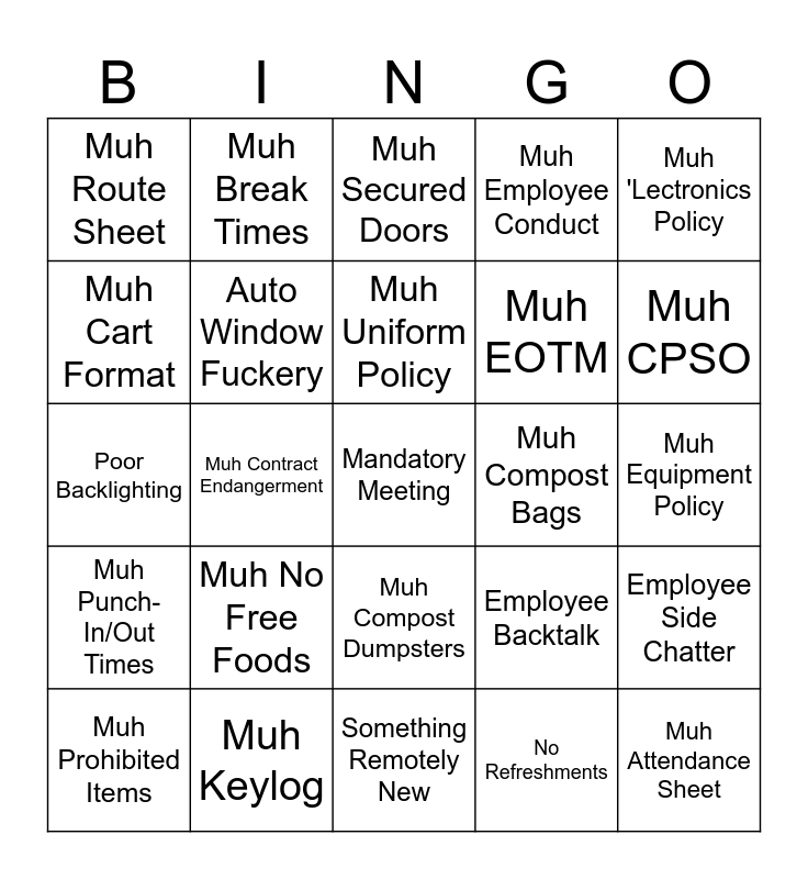 This bingo card has a free space and 24 words: Muh No Free Foods, Muh Keylog, Muh Uniform Policy, Muh Prohibited Items, Muh 'Lectronics Policy, Muh Route Sheet, Muh Cart Format, Muh Break Times, Muh Compost Bags, Muh Compost Dumpsters, Muh EOTM, Poor Backlighting, Employee Backtalk, Employee Side Chatter, Auto Window Fuckery, No Refreshments, Muh Equipment Policy, Muh Secured Doors, Muh CPSO, Muh Contract Endangerment, Muh Attendance Sheet, Muh Punch-In/Out Times, Muh Employee Conduct and Something Remotely New.