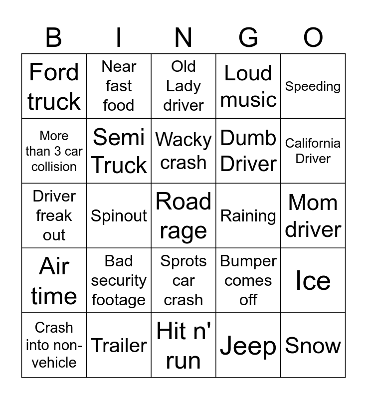 This bingo card has 30 words: Trailer, Goin through a red light, Spinout, motorcycle, Ford truck, Old Lady driver, Semi Truck, Sprots car crash, Raining, Hit n' run, Mom driver, Road rage, Jeep, Snow, California Driver, Car flips, Bumper comes off, Air time, Bad security footage, Speeding, Driver freak out, Horn honk, Near fast food, Dumb Driver, More than 3 car collision, Loud music, Ice, Crash into non-vehicle, Wacky crash and Police POV.