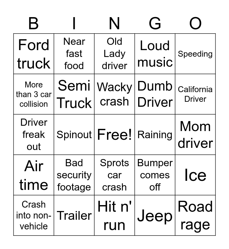 This bingo card has a free space and 30 words: Trailer, Goin through a red light, Spinout, motorcycle, Ford truck, Old Lady driver, Semi Truck, Sprots car crash, Raining, Hit n' run, Mom driver, Road rage, Jeep, Snow, California Driver, Car flips, Bumper comes off, Air time, Bad security footage, Speeding, Driver freak out, Horn honk, Near fast food, Dumb Driver, More than 3 car collision, Loud music, Ice, Crash into non-vehicle, Wacky crash and Police POV.