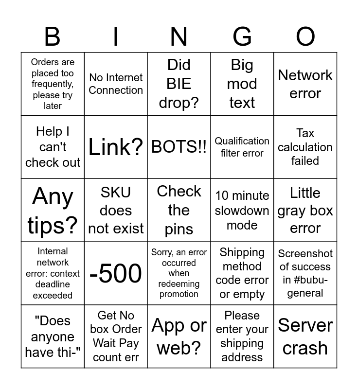 This bingo card has a free space and 24 words: -500, Get No box Order Wait Pay count err, BOTS!!, "Does anyone have thi-", Network error, Orders are placed too frequently, please try later, Help I can't check out, No Internet Connection, 10 minute slowdown mode, Sorry, an error occurred when redeeming promotion, Qualification filter error, Any tips?, Shipping method code error or empty, Screenshot of success in #bubu-general, Link?, Please enter your shipping address, Little gray box error, Did BIE drop?, Tax calculation failed, SKU does not exist, Server crash, Internal network error: context deadline exceeded, Big mod text and App or web?.