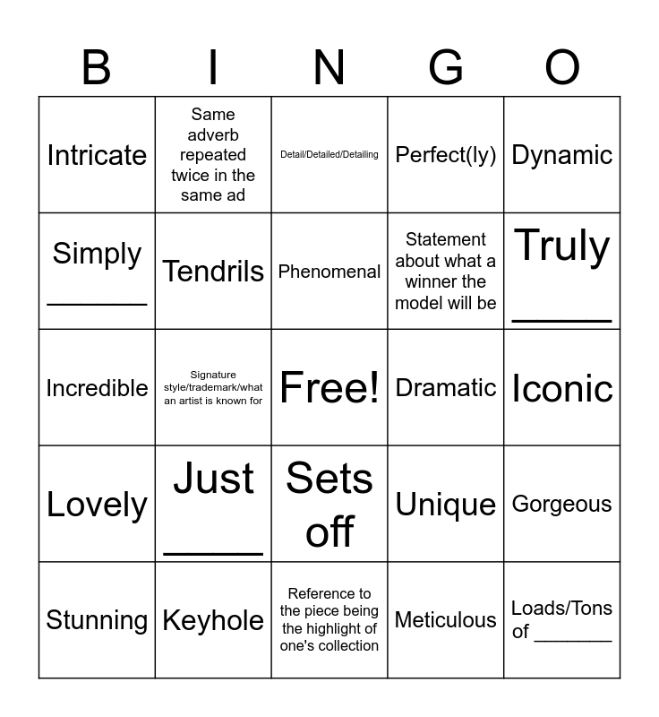 This bingo card has a free space and 24 words: Just ____, Keyhole, Phenomenal, Stunning, Dynamic, Intricate, Simply ______, Same adverb repeated twice in the same ad, Dramatic, Sets off, Statement about what a winner the model will be, Incredible, Unique, Gorgeous, Tendrils, Meticulous, Iconic, Detail/Detailed/Detailing, Truly ____, Signature style/trademark/what an artist is known for, Loads/Tons of _______, Lovely, Perfect(ly) and Reference to the piece being the highlight of one's collection.