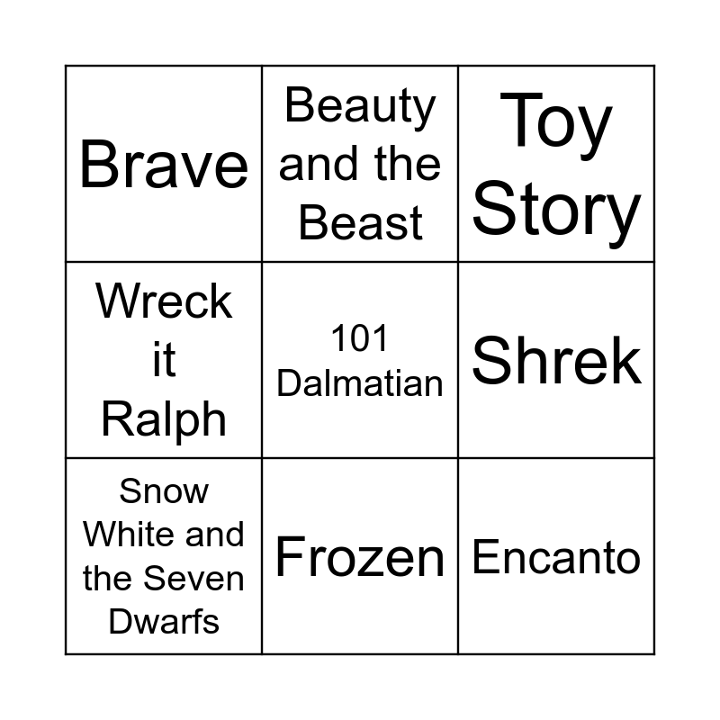 This bingo card has a free space and 8 words: Shrek, Toy Story, Beauty and the Beast, Snow White and the Seven Dwarfs, Brave, Encanto, Wreck it Ralph and Frozen.