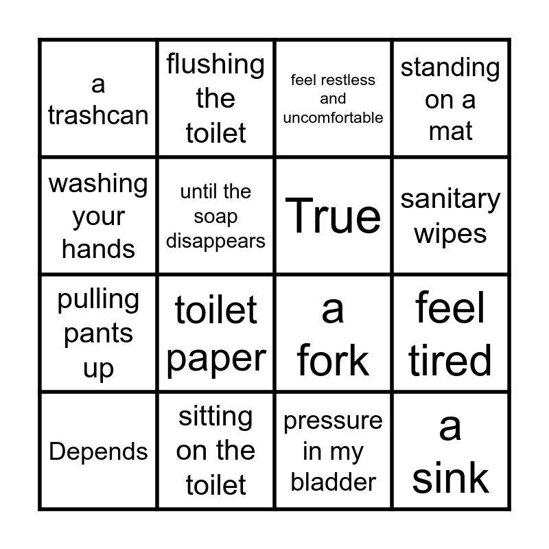 This bingo card has 28 words: pulling down pants, ripping off a piece of toilet paper, pressure in my bladder, become very hungry, washing your hands, flushing the toilet, feel restless and uncomfortable, feel tired, pulling pants up, sitting on the toilet, hold onto a grab bar, standing on a mat, turn and back up until both legs are against the surface of the toilet, immediately reach for grab bar, get as close as you can to the soap dispenser, begin reaching forward as soon as you can see the soap dispenser, at least 20 seconds, until the soap disappears, a fork, a sink, a trashcan, wiping front to back, wiping back to front, sanitary wipes, Depends, toilet paper, True and False.