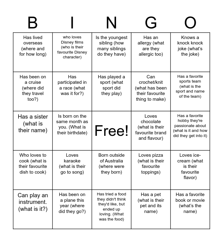 This bingo card has a free space and 29 words: Can play an instrument. (what is it?), Can play an instrument. (what is it?), Is born on the same month as you. (What is their birthdate), Speaks 2 languages (what are they), Has lived overseas (where and for how long), Is the youngest sibling (how many siblings do they have), Has participated in a race (what was it for?), Loves karaoke (what is their go to song), Loves chocolate (what is their favourite brand and flavour), Has been on a plane this year (where did they go?), Has a favorite hobby they're passionate about (what is it and how did they get into it), Has a favorite book or movie (what’s the name), Has tried a food they didn't think they'd like, but ended up loving. (What was the food), Has a pet (what is their pet and its name), Has a favorite sports team (what is the sport and name of the team), Has read more than 3 books in the past year (what is their favourite out of the 4), Born outside of Australia (where were they born), Who loves to cook (what is their favourite dish to cook), Knows a knock knock joke (what’s the joke), Has a sister (what is their name), Loves pizza (what is their favourite toppings), Seen a broadway show (what was the name of the show they saw), Can crochet/knit (what has been their favourite thing to make), Has been on a cruise (where did they travel too?), Has an allergy (what are they allergic too), who loves Disney films (who is their favourite Disney character), Loves ice-cream (what is their favourite flavor), Has played a sport (what sport did they play) and Has a unique Talent (what is the Talent).