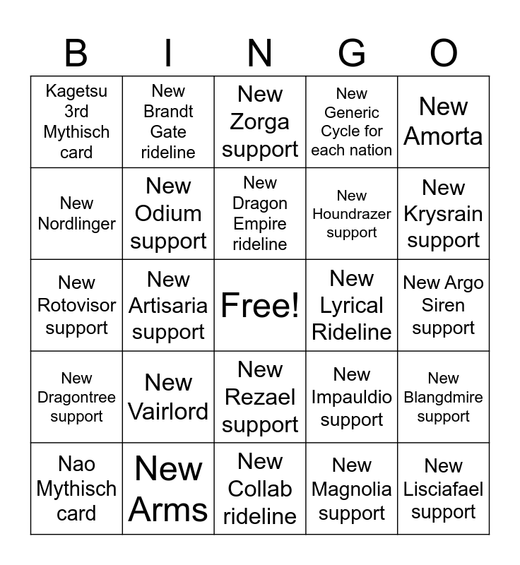 This bingo card has a free space and 24 words: New Vairlord, New Arms, New Dragon Empire rideline, Nao Mythisch card, New Amorta, Kagetsu 3rd Mythisch card, New Nordlinger, New Brandt Gate rideline, New Lyrical Rideline, New Rezael support, New Houndrazer support, New Rotovisor support, New Impauldio support, New Blangdmire support, New Odium support, New Magnolia support, New Argo Siren support, New Zorga support, New Krysrain support, New Artisaria support, New Lisciafael support, New Dragontree support, New Generic Cycle for each nation and New Collab rideline.