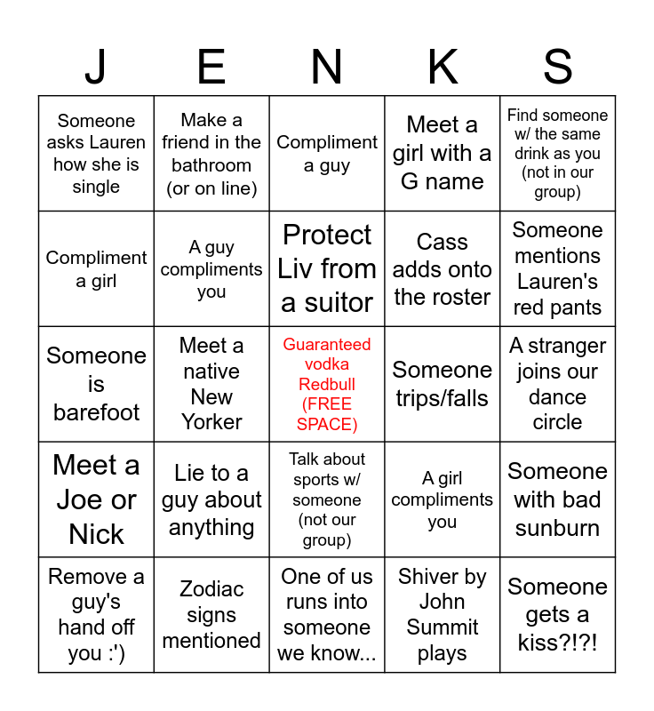 This bingo card has a free space and 24 words: Lie to a guy about anything, Zodiac signs mentioned, Protect Liv from a suitor, Remove a guy's hand off you :'), Find someone w/ the same drink as you (not in our group), Someone asks Lauren how she is single, Compliment a girl, Make a friend in the bathroom (or on line), Someone trips/falls, Talk about sports w/ someone (not our group), Cass adds onto the roster, Someone is barefoot, A girl compliments you, Someone with bad sunburn, A guy compliments you, Shiver by John Summit plays, A stranger joins our dance circle, Compliment a guy, Someone mentions Lauren's red pants, Meet a native New Yorker, Someone gets a kiss?!?!, Meet a Joe or Nick, Meet a girl with a G name and One of us runs into someone we know....