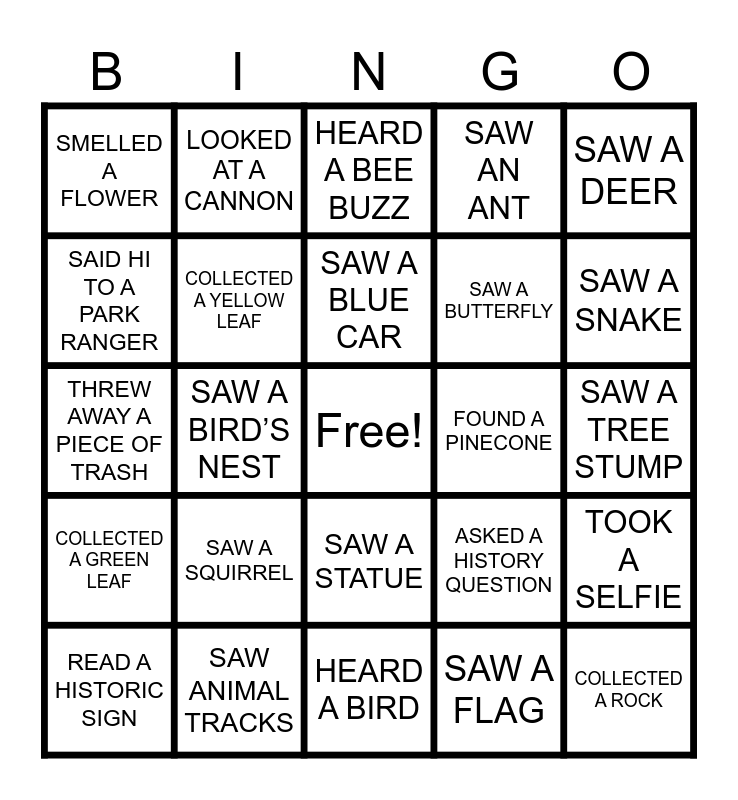 This bingo card has a free space and 25 words: SAW A SQUIRREL, HEARD A BIRD, SAW A BLUE CAR, READ A HISTORIC SIGN, SAW A DEER, SMELLED A FLOWER, SAID HI TO A PARK RANGER, LOOKED AT A CANNON, FOUND A PINECONE, SAW A STATUE, SAW A BUTTERFLY, THREW AWAY A PIECE OF TRASH, ASKED A HISTORY QUESTION, TOOK A SELFIE, COLLECTED A YELLOW LEAF, FOUND A FEATHER, SAW A TREE STUMP, HEARD A BEE BUZZ, SAW A SNAKE, SAW A BIRD’S NEST, COLLECTED A ROCK, SAW ANIMAL TRACKS, COLLECTED A GREEN LEAF, SAW AN ANT and SAW A FLAG.