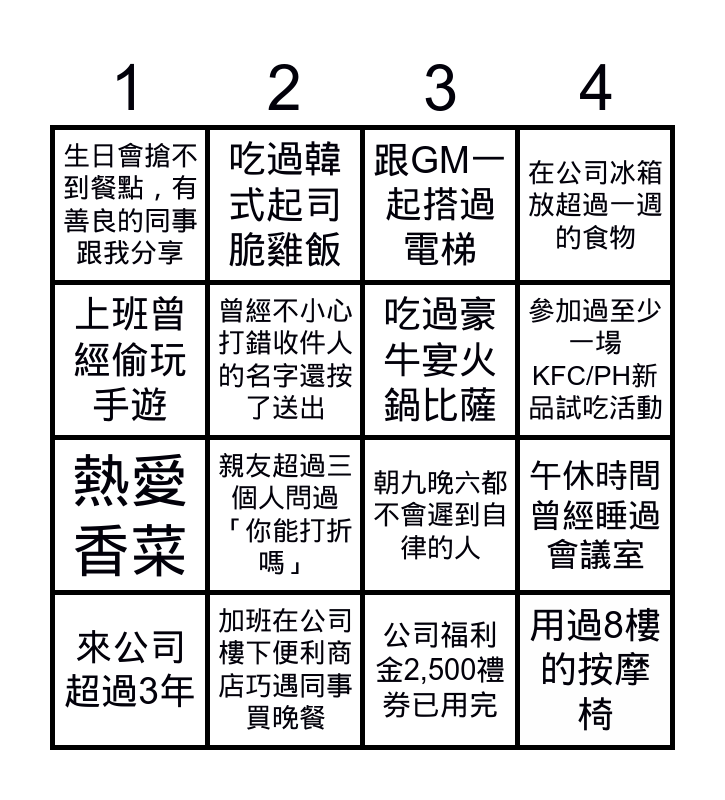 This bingo card has 16 words: 加班在公司樓下便利商店巧遇同事買晚餐, 午休時間曾經睡過會議室, 跟GM一起搭過電梯, 生日會搶不到餐點,有善良的同事跟我分享, 熱愛香菜, 吃過韓式起司脆雞飯, 朝九晚六都不會遲到自律的人, 公司福利金2,500禮券已用完, 上班曾經偷玩手遊, 曾經不小心打錯收件人的名字還按了送出, 來公司超過3年, 在公司冰箱放超過一週的食物, 親友超過三個人問過「你能打折嗎」, 參加過至少一場KFC/PH新品試吃活動, 吃過豪牛宴火鍋比薩 and 用過8樓的按摩椅.