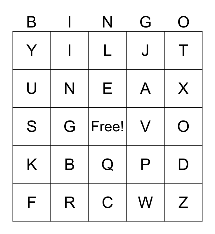 This bingo card has a free space and 26 words: Q, W, E, R, T, Y, U, I, O, P, A, S, D, F, G, H, J, K, L, Z, X, C, V, B, N and M.