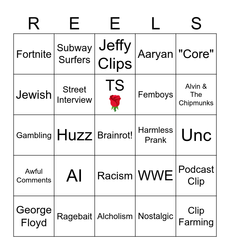 This bingo card has a free space and 24 words: George Floyd, AI, TS 🌹, Nostalgic, "Core", Fortnite, Subway Surfers, Jeffy Clips, Harmless Prank, Unc, Gambling, Street Interview, WWE, Podcast Clip, Jewish, Ragebait, Alcholism, Aaryan, Alvin & The Chipmunks, Awful Comments, Huzz, Racism, Femboys and Clip Farming.