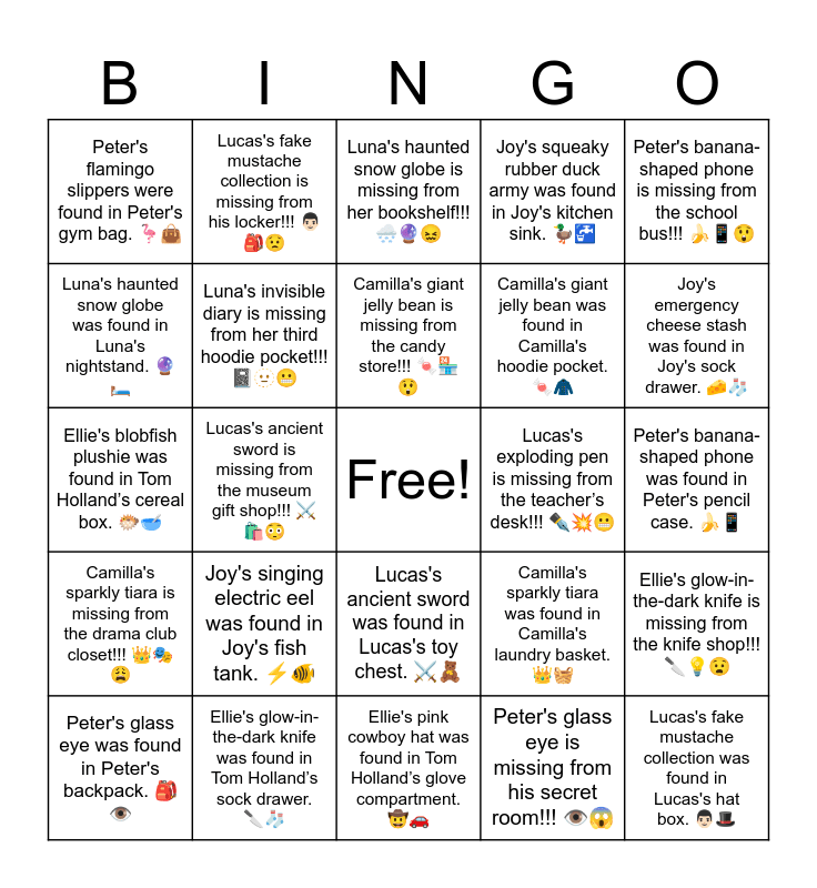 This bingo card has a free space and 32 words: Peter's glass eye is missing from his secret room!!! ๐๏ธ๐ฑ, Ellie's blobfish plushie is missing from her backpack!!! ๐ก๐๐จ, Lucas's ancient sword is missing from the museum gift shop!!! โ๏ธ๐๏ธ๐ณ, Joy's singing electric eel is missing from the science lab!!! โก๐งช๐ต, Camilla's sparkly tiara is missing from the drama club closet!!! ๐๐ญ๐ฉ, Luna's invisible diary is missing from her third hoodie pocket!!! ๐๐ซฅ๐ฌ, Peter's banana-shaped phone is missing from the school bus!!! ๐๐ฑ๐ฒ, Ellie's glow-in-the-dark knife is missing from the knife shop!!! ๐ช๐ก๐ง, Lucas's fake mustache collection is missing from his locker!!! ๐จ๐ป๐๐, Joy's squeaky rubber duck army is missing from the bathtub!!! ๐ฆ๐๐ฑ, Camilla's giant jelly bean is missing from the candy store!!! ๐ฌ๐ช๐ฒ, Luna's haunted snow globe is missing from her bookshelf!!! ๐จ๏ธ๐ฎ๐, Peter's flamingo slippers are missing from under his bed!!! ๐ฆฉ๐ฅฟ๐ฉ, Ellie's pink cowboy hat is missing from the gym storage room!!! ๐ค ๐๐ต, Lucas's exploding pen is missing from the teacherโs desk!!! โ๏ธ๐ฅ๐ฌ, Joy's emergency cheese stash is missing from the fridge!!! ๐งโ๏ธ๐ณ, Peter's glass eye was found in Peter's backpack. ๐๐๏ธ, Ellie's blobfish plushie was found in Tom Hollandโs cereal box. ๐ก๐ฅฃ, Lucas's ancient sword was found in Lucas's toy chest. โ๏ธ๐งธ, Joy's singing electric eel was found in Joy's fish tank. โก๐ , Camilla's sparkly tiara was found in Camilla's laundry basket. ๐๐งบ, Luna's invisible diary was found in Luna's safe. ๐๐, Peter's banana-shaped phone was found in Peter's pencil case. ๐๐ฑ, Ellie's glow-in-the-dark knife was found in Tom Hollandโs sock drawer. ๐ช๐งฆ, Lucas's fake mustache collection was found in Lucas's hat box. ๐จ๐ป๐ฉ, Joy's squeaky rubber duck army was found in Joy's kitchen sink. ๐ฆ๐ฐ, Camilla's giant jelly bean was found in Camilla's hoodie pocket. ๐ฌ๐งฅ, Luna's haunted snow globe was found in Luna's nightstand. ๐ฎ๐๏ธ, Peter's flamingo slippers were found in Peter's gym bag. ๐ฆฉ๐, Ellie's pink cowboy hat was found in Tom Hollandโs glove compartment. ๐ค ๐, Lucas's exploding pen was found in Lucas's science notebook. โ๏ธ๐ and Joy's emergency cheese stash was found in Joy's sock drawer. ๐ง๐งฆ.