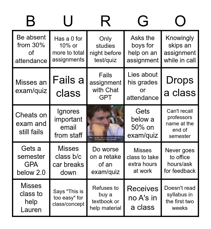 This bingo card has a free space and 24 words: Misses class b/c car breaks down, Says "This is too easy" for class/concept, Fails assignment with Chat GPT, Misses class to help Lauren, Knowingly skips an assignment while in call, Be absent from 30% of attendance, Misses an exam/quiz, Has a 0 for 10% or more to total assignments, Gets below a 50% on exam/quiz, Do worse on a retake of an exam/quiz, Lies about his grades or attendance, Cheats on exam and still fails, Misses class to take extra hours at work, Never goes to office hours/ask for feedback, Fails a class, Receives no A's in a class, Can't recall professors name at the end of semester, Only studies night before test/quiz, Drops a class, Ignores important email from staff, Doesn't read syllabus in the first two weeks, Gets a semester GPA below 2.0, Asks the boys for help on an assignment and Refuses to buy a textbook or help material.