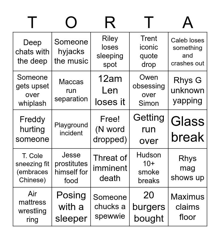 This bingo card has a free space and 24 words: Jesse prostitutes himself for food, Posing with a sleeper, 12am Len loses it, Air mattress wrestling ring, Caleb loses something and crashes out, Deep chats with the deep, Someone gets upset over whiplash, Someone hyjacks the music, Getting run over, Threat of imminent death, Owen obsessing over Simon, Freddy hurting someone, Hudson 10+ smoke breaks, Rhys mag shows up, Maccas run separation, 20 burgers bought, Glass break, Riley loses sleeping spot, Rhys G unknown yapping, Playground incident, Maximus claims floor, T. Cole sneezing fit (embraces Chinese), Trent iconic quote drop and Someone chucks a spewwie.
