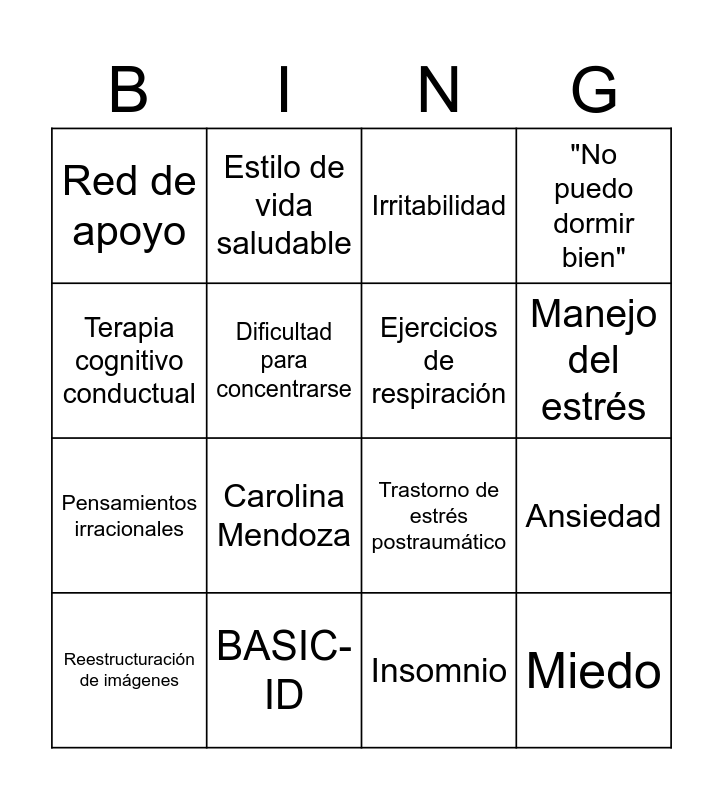 This bingo card has 20 words: Ansiedad, Terapia de exposición, Irritabilidad, Sensibilidad al ruido, Reestructuración de imágenes, Terapia cognitivo conductual, BASIC-ID, Red de apoyo, Pensamientos irracionales, Estilo de vida saludable, Carolina Mendoza, Trastorno de estrés postraumático, Dificultad para concentrarse, Miedo, Ejercicios de respiración, 27 años, Manejo del estrés, "No puedo dormir bien", Insomnio and Estrategias de organización.