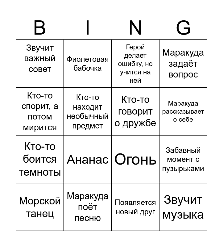 This bingo card has 16 words: Маракуда поёт песню, Забавный момент с пузырьками, Герой делает ошибку, но учится на ней, Звучит важный совет, Кто-то боится темноты, Фиолетовая бабочка, Огонь, Появляется новый друг, Кто-то спорит, а потом мирится, Кто-то находит необычный предмет, Морской танец, Маракуда задаёт вопрос, Ананас, Маракуда рассказывает о себе, Кто-то говорит о дружбе and Звучит музыка.