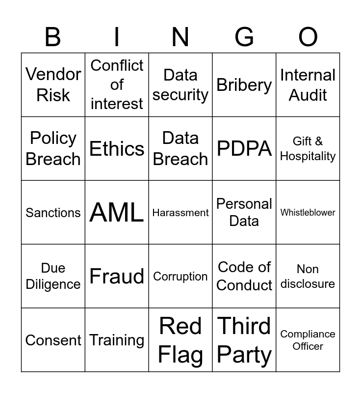 This bingo card has a free space and 24 words: Fraud, Training, Data Breach, Consent, Internal Audit, Vendor Risk, Policy Breach, Conflict of interest, Personal Data, Corruption, PDPA, Sanctions, Code of Conduct, Non disclosure, Ethics, Third Party, Whistleblower, Data security, Gift & Hospitality, AML, Compliance Officer, Due Diligence, Bribery and Red Flag.