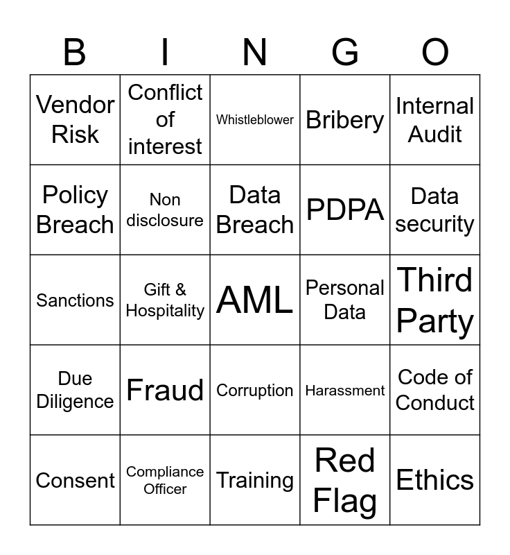 This bingo card has 25 words: Fraud, Training, Data Breach, Consent, Internal Audit, Vendor Risk, Policy Breach, Conflict of interest, Personal Data, Corruption, PDPA, Sanctions, Harassment, Code of Conduct, Non disclosure, Ethics, Third Party, Whistleblower, Data security, Gift & Hospitality, AML, Compliance Officer, Due Diligence, Bribery and Red Flag.
