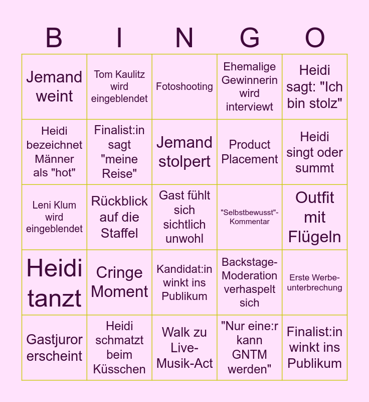 This bingo card has a free space and 24 words: Cringe Moment, Heidi schmatzt beim Küsschen, Jemand stolpert, Gastjuror erscheint, Heidi sagt: "Ich bin stolz", Jemand weint, Heidi bezeichnet Männer als "hot", Tom Kaulitz wird eingeblendet, "Selbstbewusst"-Kommentar, Kandidat:in winkt ins Publikum, Product Placement, Leni Klum wird eingeblendet, Backstage-Moderation verhaspelt sich, Erste Werbe-unterbrechung, Finalist:in sagt "meine Reise", "Nur eine:r kann GNTM werden", Outfit mit Flügeln, Fotoshooting, Heidi singt oder summt, Rückblick auf die Staffel, Finalist:in winkt ins Publikum, Heidi tanzt, Ehemalige Gewinnerin wird interviewt and Walk zu Live-Musik-Act.